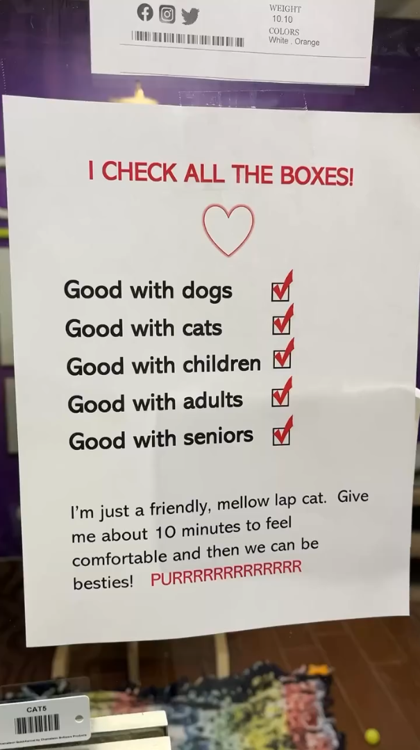 CAT5 WEIGHT 10.10 COLORS White. Orange I CHECK ALL THE BOXES! Good with dogs Good with cats Good with children Good with adults Good with seniors I'm just a friendly, mellow lap cat. Give me about 10 minutes to feel comfortable and then we can be besties! PURRRRRRRRRRRRR