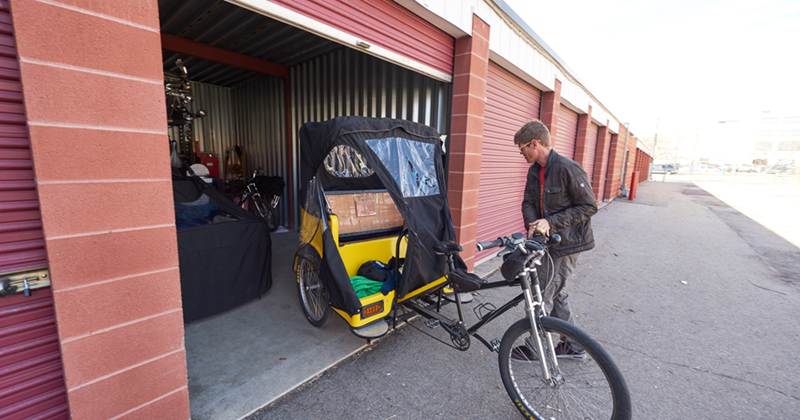 • Man standing outside a row of storage units, pulling a yellow cargo bicycle with a covered rear compartment out of an open garage unit.