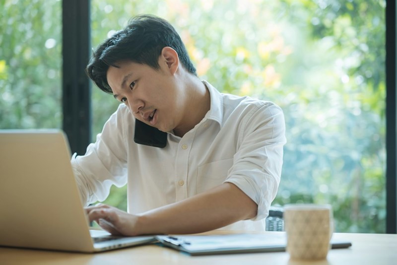 • Busy worker talks on phone while typing on laptop at the same time, looking stressed out.