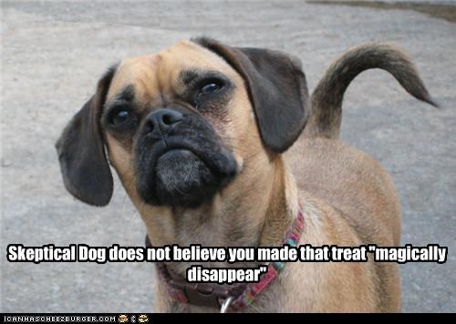 Skeptical Dog does not believe you made that treat "magically disappear"