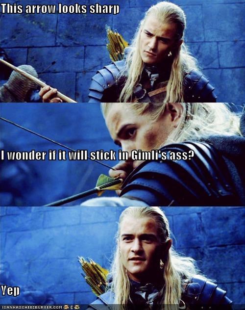 This arrow looks sharp I wonder if it will stick in Gimli's ass? Yep (Orlando Bloom)