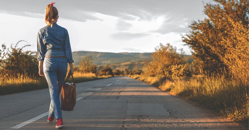 Woman hitchhiking on road.