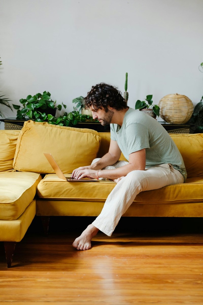 A man sitting sideways on a large couch with plants behind it uses a laptop