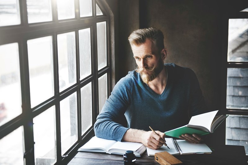 Poet sits by bright window while pondering and writing.