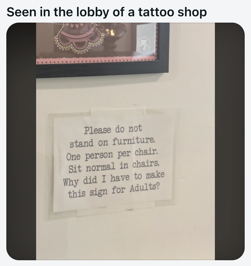 Even funnier that it's in a tattoo shop! Which is a place where, notoriously, the artists will not do a tattoo on you if you're acting a fool.