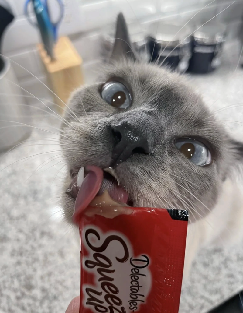 That little face is clearly asking for a treat. Just sitting there looking up like it knows exactly what it’s doing. It’s the kind of look that’s very hard to say no to. Once a cat pulls out that expression, the decision is pretty much made. One treat usually turns into two pretty quickly.