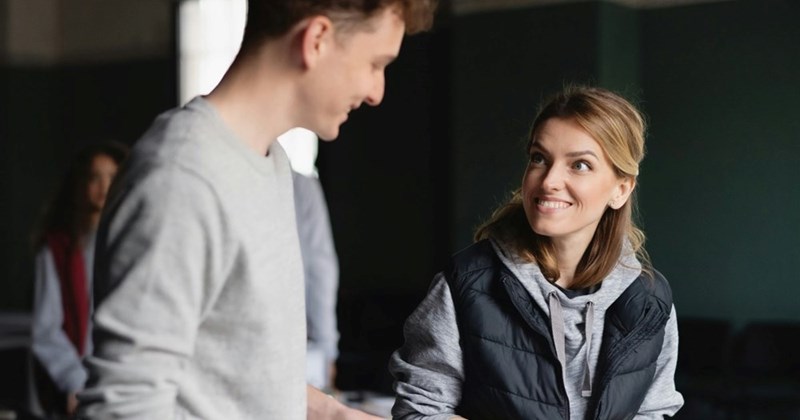 • A resident speaks to his female neighbor in the mail room of their apartment complex.