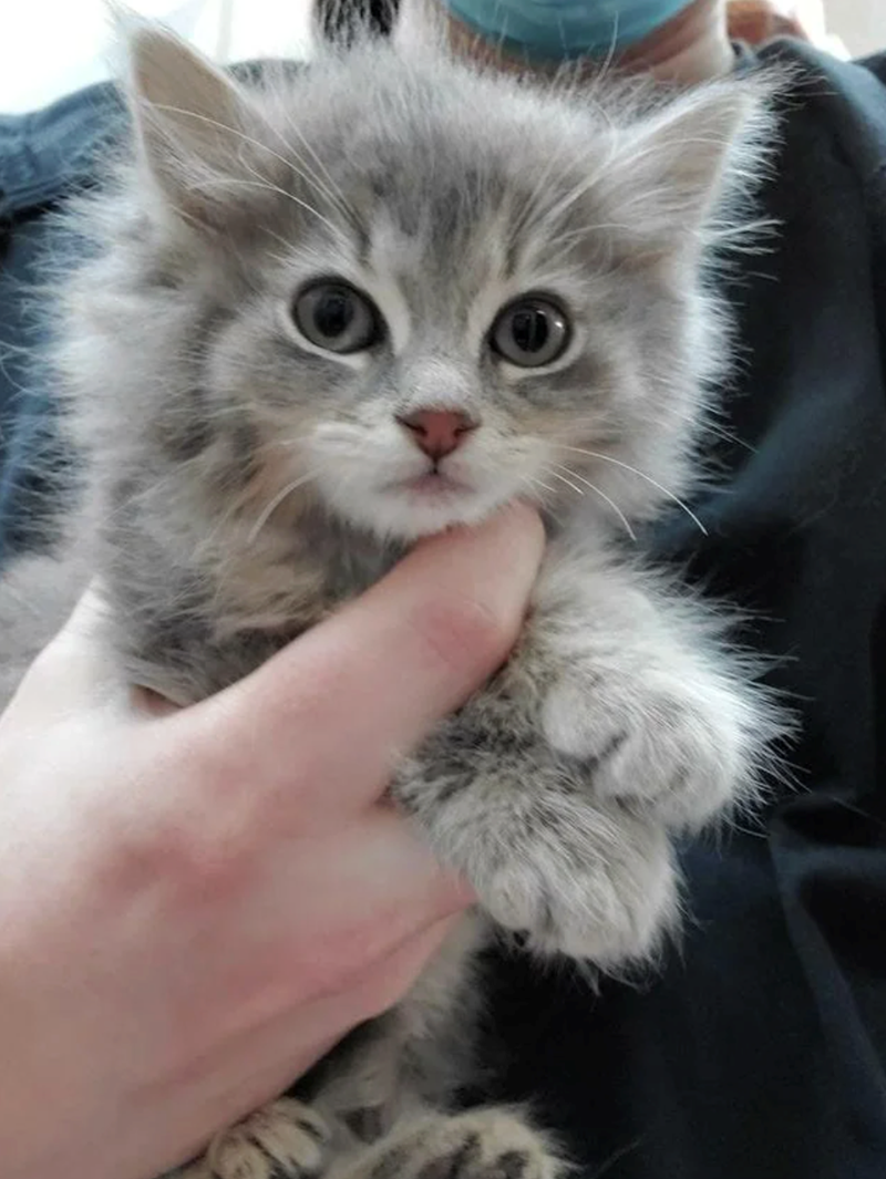 There is nothing cuter than this fluffy little guy. Just a tiny ball of fur with a face and some little paws sticking out. The kind of kitten that makes people stop and smile the second they see it. All that soft fuzz makes him look like a walking puffball. Honestly hard to imagine anything more adorable than a kitten this small and this fluffy sitting there.