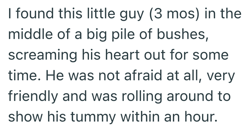 That cat clearly picked you. Not every kitten runs right up to people and starts rolling around for belly rubs within an hour. Sounds like he decided pretty quickly that you were the safe human in the situation. Some cats just know where they want to end up. The fact that he stuck around and bonded so fast makes it feel like the choice was already made on his end.