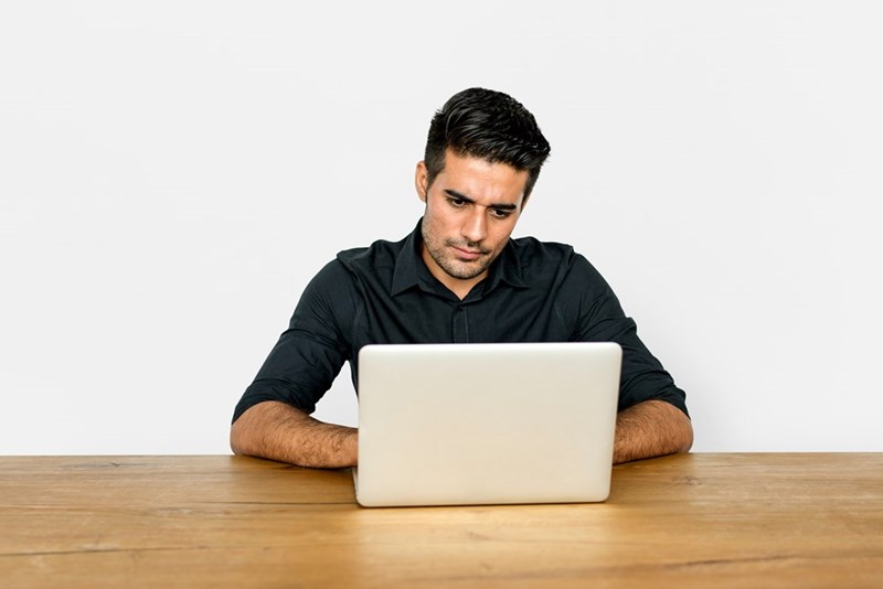 • Man types an email to the boss to point out coworker's small mistake.