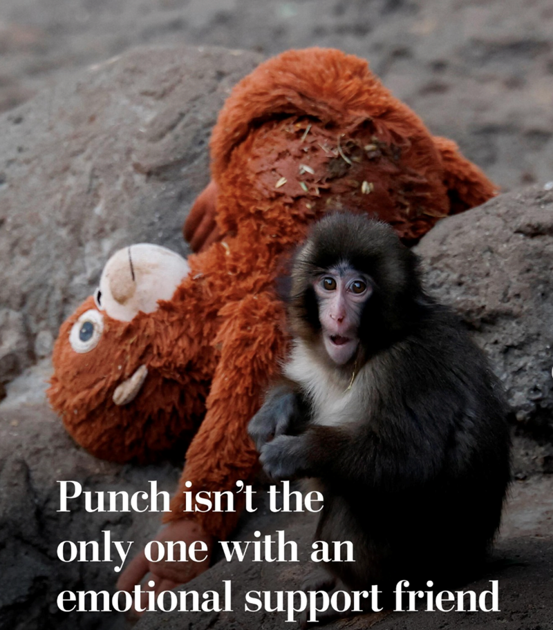 It makes sense to us that three of the six animals are primates, seeing as how we're not so different from them if you think about it! Just like Punch loves and finds security in his stuffed orange monkey, Foxie found something special in her tiny troll doll. Isn't it interesting that she now plays with all kinds of dolls? To us, it's fascinating!