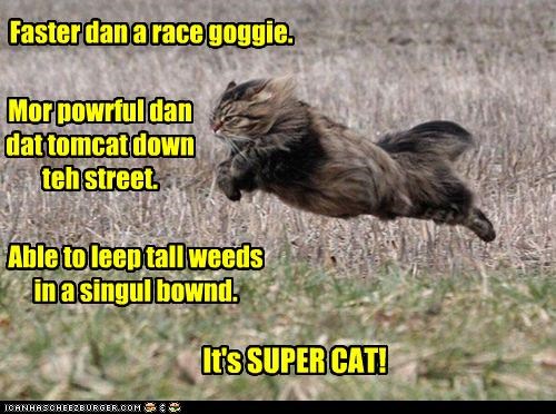 Faster dan a race goggie. Mor powrful dan dat tomcat down teh street. Able to leep tall weeds in a singul bownd. It's SUPER CAT!