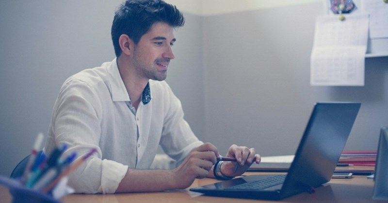 A businessman works on his laptop in a cubicle when he starts to suspect that his device is being tracked.