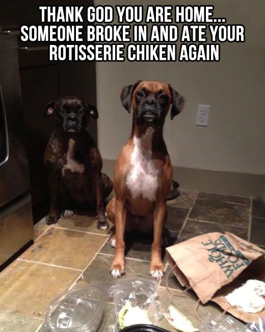 Man, we need to do more silly things like this in our lives. Like why should we confine ourselves to constantly being well behaved when it serves us so much better to be a little wild and unpredictable from time to time. Like these doggos for example, they would have had one heck of a time destroying that chicken. And now that they are navigating the muddy waters of getting caught they are at least left with the delicious memory of what it was like to tear that bird limb from delicious limb. So the next time you have the opportunity to operate outside the lines, go for it.