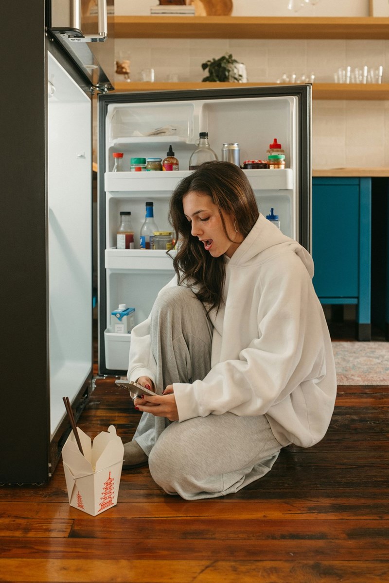 • Woman sitting on the kitchen floor by an open fridge, looking at her phone with a takeout box beside her.