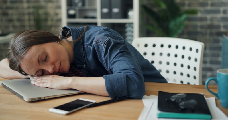 A female employee takes a nap with her head resting on her closed laptop, a notebook, cellphone, and mug beside her
