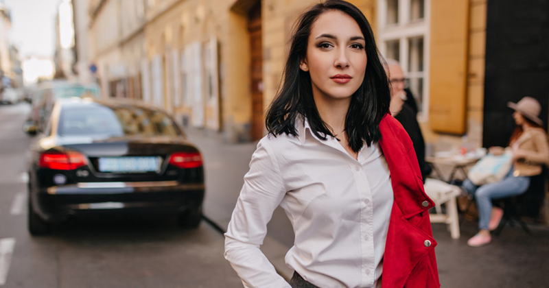 • Woman looking confident in front of a car parked on the street.