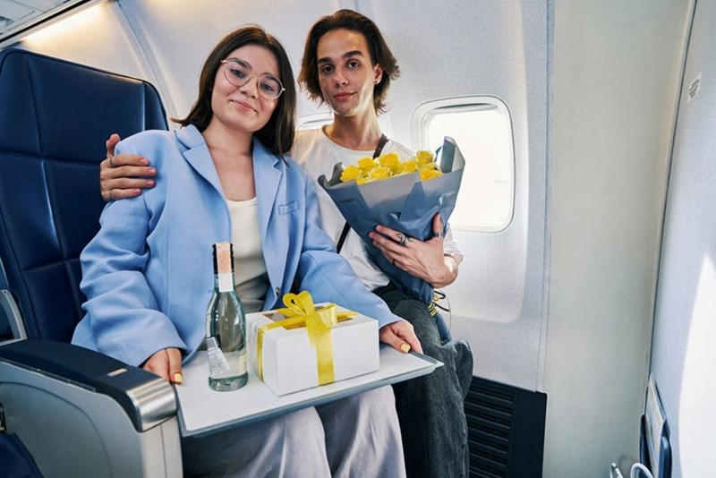 A young newlywed couple sits together in first class, holding gifts and flowers from the airline.