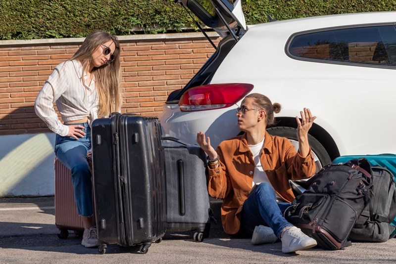 • Two people arguing beside an open car trunk with suitcases, appearing frustrated during travel.
