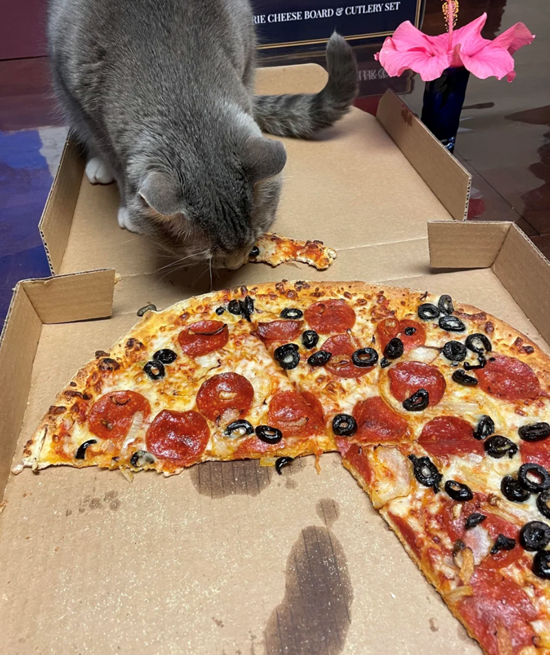 Why eat the pizza when you can just be the pizza? This cat clearly chose the better option. Fully committed to the look, just sitting there like this is completely normal. No need to fight for a slice when you are the slice. Just existing as the pizza and making it work.