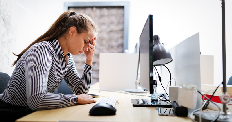 Overworked and frustrated young woman in front of computer in office.