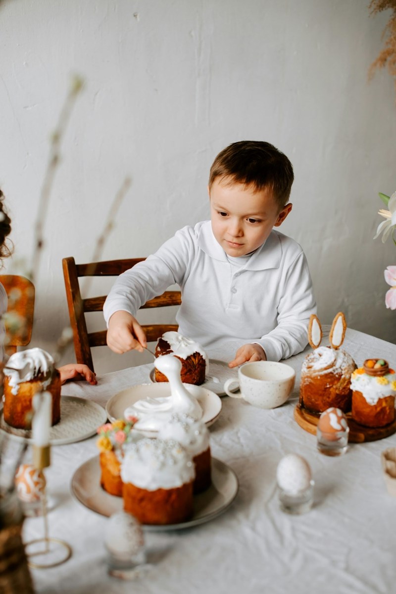 A little boy sitting at a table decorated with plates of a cakes and a bouquet of flowers eats icing from a plate