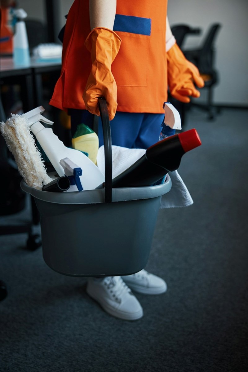 The legs of a woman in a cleaning uniform, standing in an office while holding a bucket of cleaning products