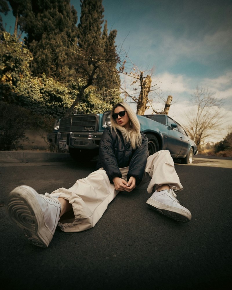 Woman poses in front of old car.