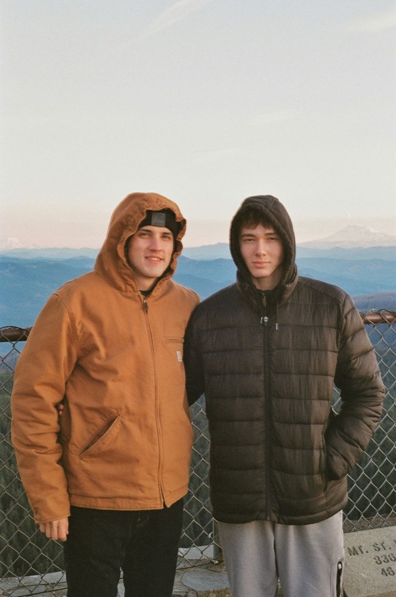• Two men standing next to each other in front of a fence