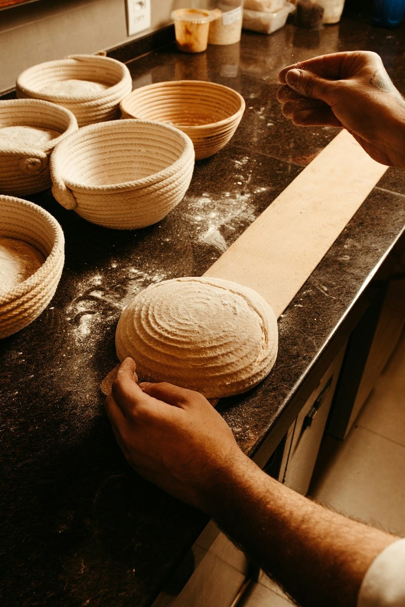 A woman works on kneading a loaf of sourdough