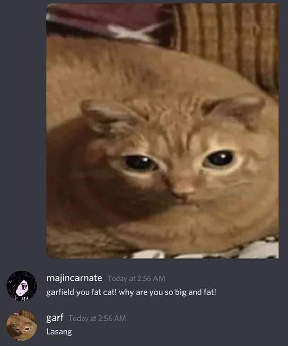 majincarnate Today at 2:56 AM garfield you fat cat! why are you so big and fat! garf Today at 2:56 AM Lasang