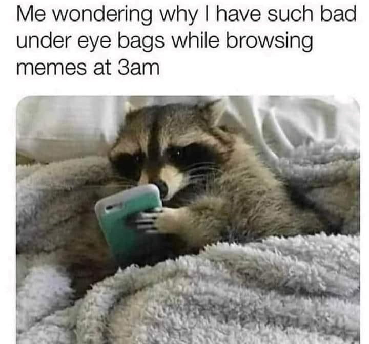When you boot up your phone late at night, swearing in your heart that “Today it's just going to take five minutes. I'm going to fall asleep early and wake up refreshed tomorrow morning, ready to take on another day. I'm ready for the change.” your inner raccoon soul is having a good laugh. Your inner raccoon knows you're going to scroll for at least three hours, then get up and stare at the fridge because now you're hungry from being awake for so long, and then return to the sacred task of continuing to scroll more and more memes until the first light of the sun creeps through your window.