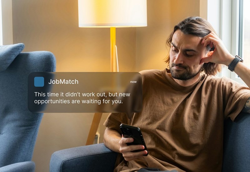 • A man looks at his phone with a job rejection notification
