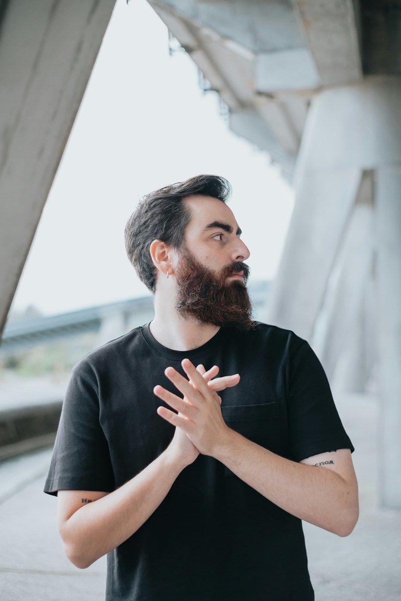 A man with a beard standing in front of a bridge