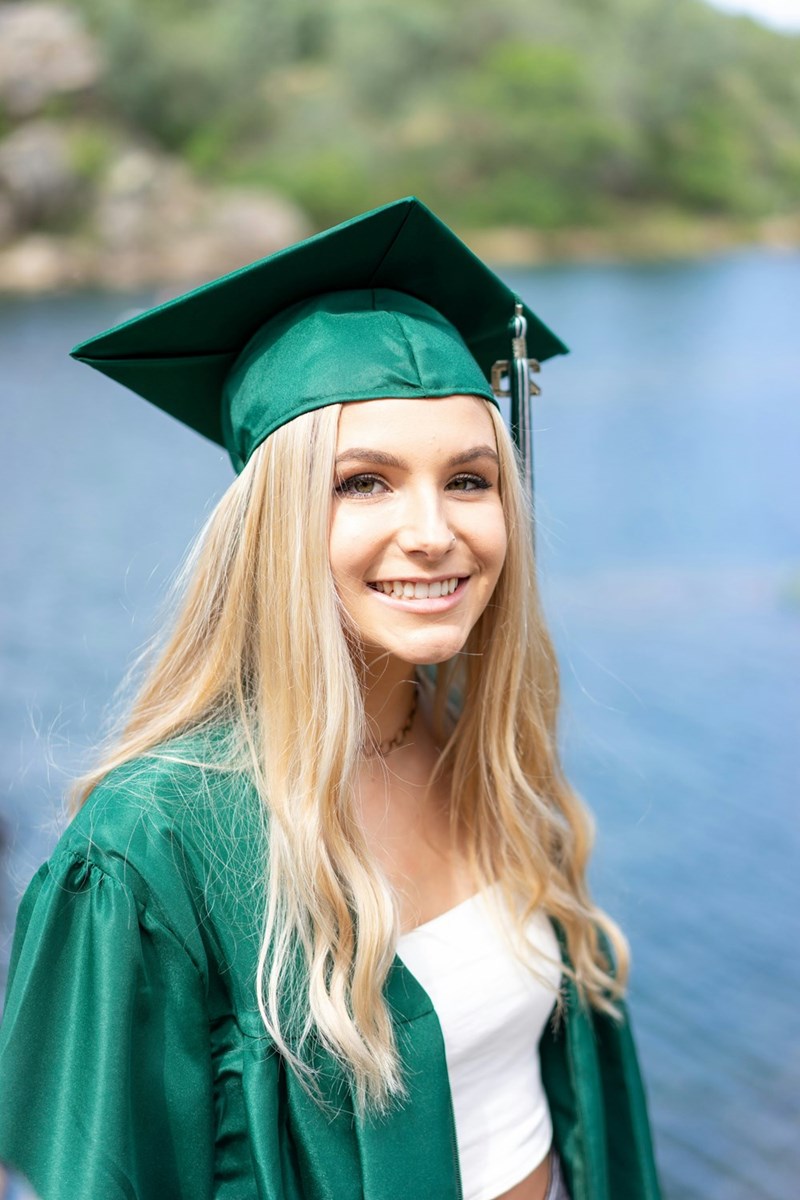 A high school graduate smiling, content that her dad won't attend her graduation ceremony.