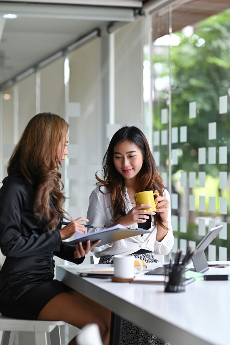 • A young employee in her twenties assists another coworker, who is a few years younger, in the office.