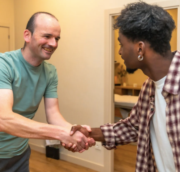 Tenant shakes the landlord's hand after he helps him with a neighborly dispute.