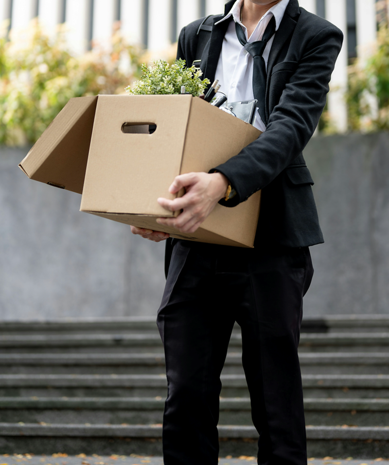 An employee walks out with his belongings in a box