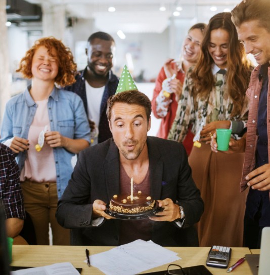 Workers reluctantly celebrate their boss's birthday.