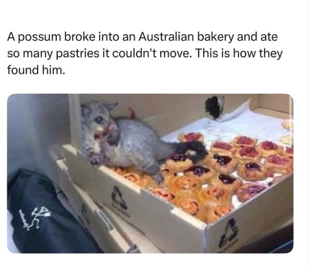 A possum broke into an Australian bakery and ate so many pastries it couldn't move. This is how they found him.