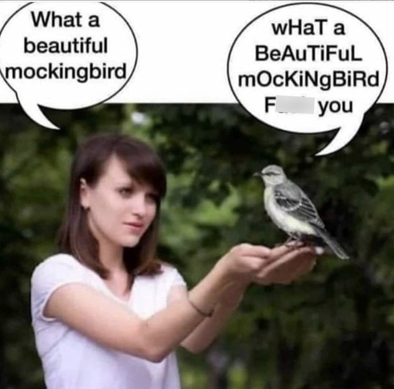 To understand how bonkers birds are, take the mockingbird for example. While we're well aware that they don't mock anyone like in this meme (maybe they do in their hearts, who knows), there's actually a good reason for why they're called like that. A mockingbird is called a mockingbird because of its remarkable ability to mimic (or "mock") the sounds of other birds, animals, and even mechanical noises (coughing, they're drones, coughing). They are master mimics, incorporating even hundreds of different sounds into their songs, sometimes repeating a sound up to 87 times in just a few minutes.