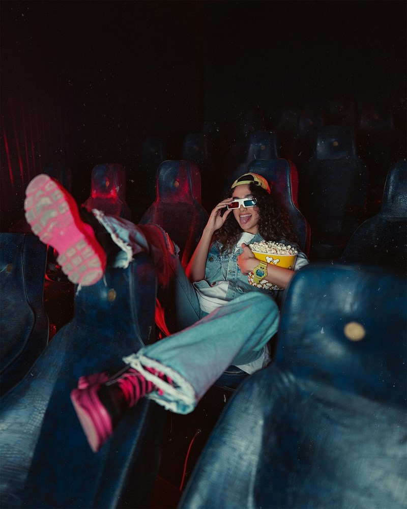 Teen girl sits happily in movie theater, propping her sneakers on the seats in front of her while holding a bucket of popcorn.