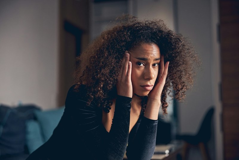 A stressed woman holds her head, clearly overwhelmed by frustration and noise.