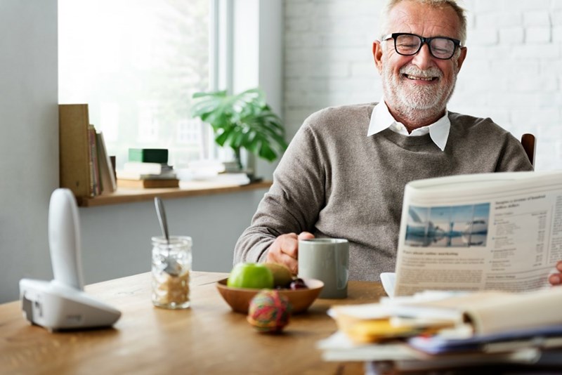 Jolly old man with a white beard, smiles while he reads the newspaper and drinks a cup of coffee in his home. -