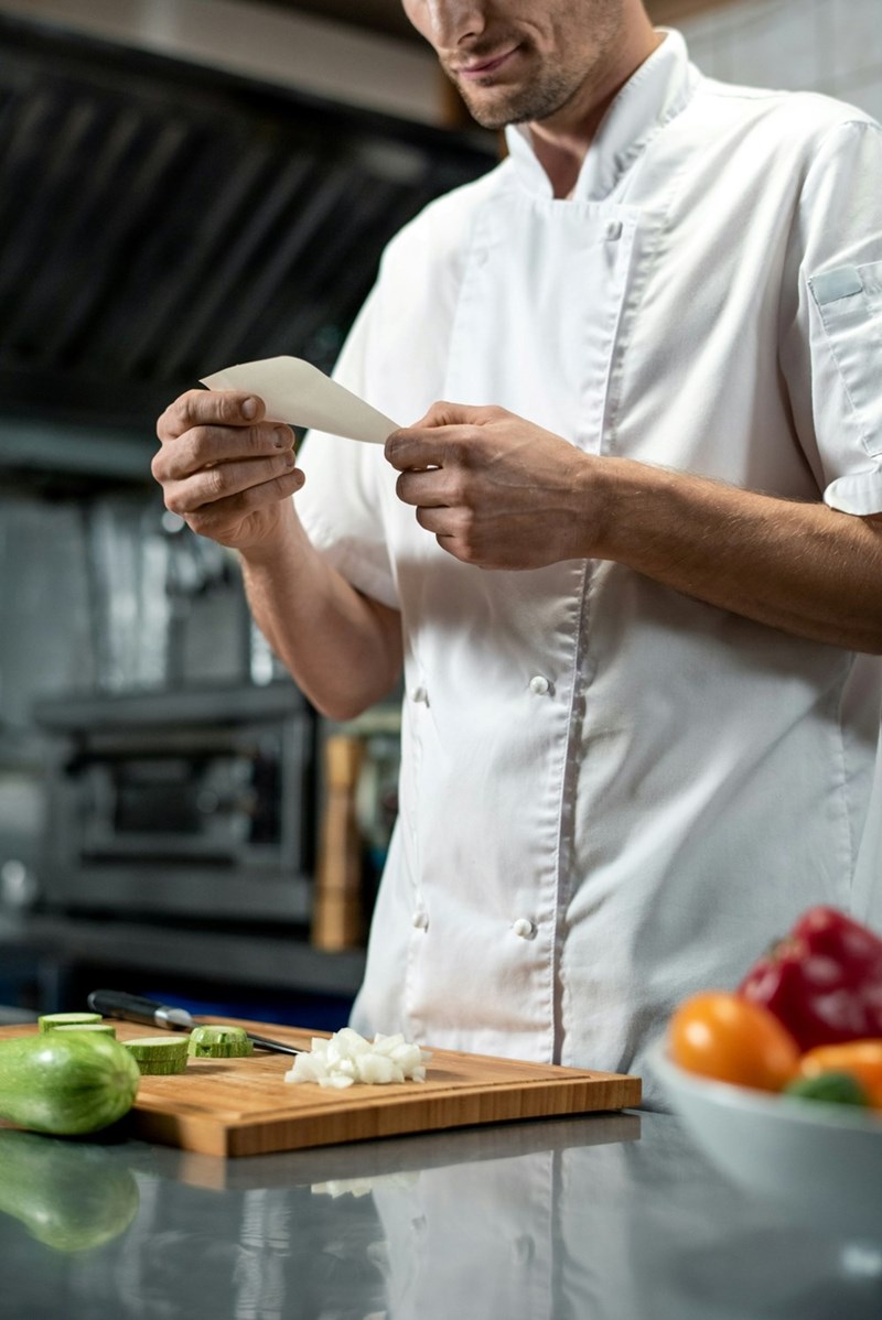 A man wearing chef whites reads a piece of paper while standing in a kitchen with a chopping board and ingredients in front of him