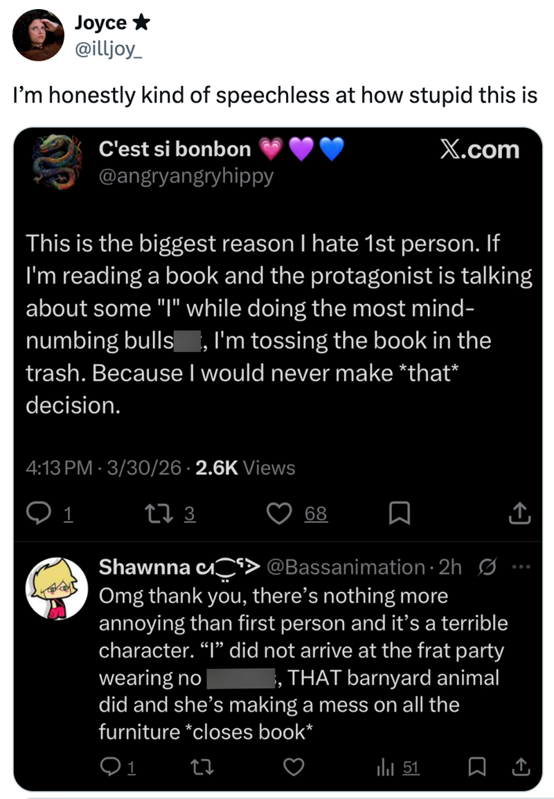 Lovers of literature don’t actually care about first-person or third, as long as the story is enthralling. It makes you wonder why Zoomers aren’t more critical of first-person films or video games.
