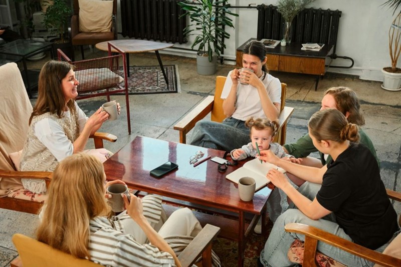 A group of mom friends is drinking tea and talking together while their kids play in another room.