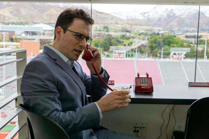 Hardworking employee sitting at his desk, talking on the phone with a client.