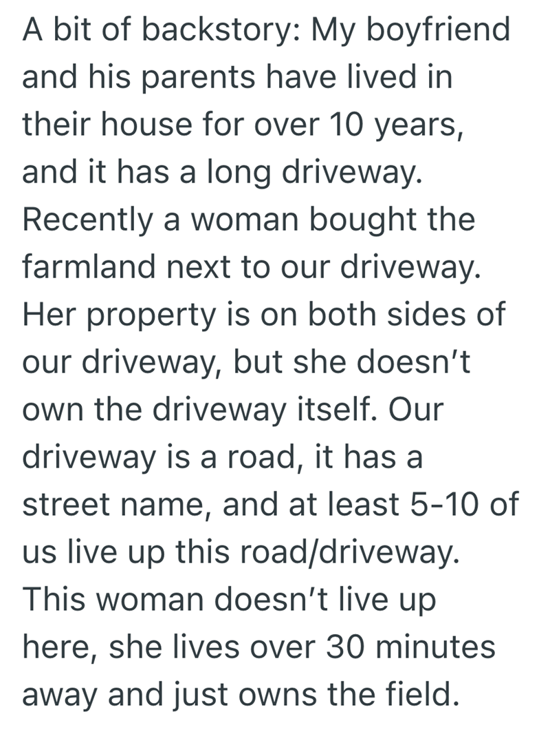 You see stories like this often, and this one is no different. With this new neighbor, it was no different. The family had lived in the home for a decade, but when a new neighbor bought the field next to their rural home, she began making increasing demands, culminating in trespassing on their own driveway.