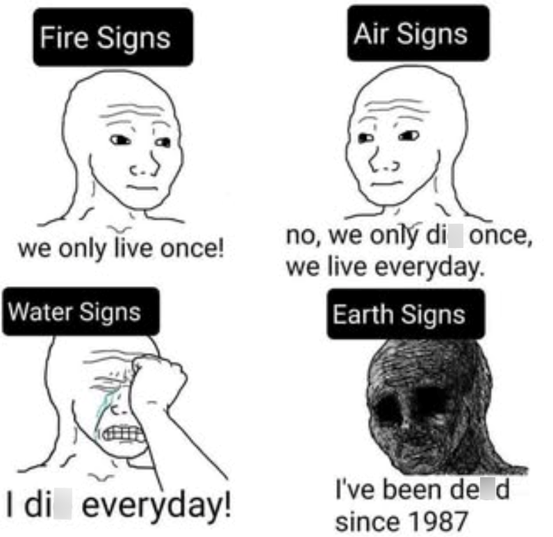 Air Signs Fire Signs we only live once! no, we only di once, we live everyday. Water Signs Earth Signs I di everyday! I've been de d since 1987
